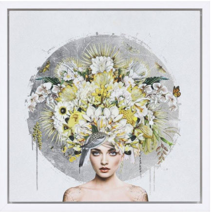 At the heart of Nature's Alchemy II stands a striking woman, her gaze steady and assured as she faces the viewer directly. Around her, an exquisite arrangement of foliage and birds forms a majestic headdress, evoking nature's beauty and its unspoken authority. The composition appears to flow organically, giving the impression of layered collage, yet each element is seamlessly integrated to create a harmonious, painterly whole. Rendered in a refined palette of whites, creams, greys, and greens, the piece exudes quiet sophistication, with the soft tones enhancing its ethereal stillness and strength.