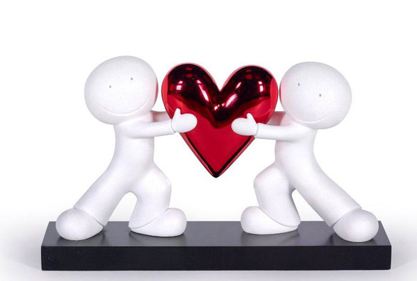 The piece features two of Hydes instantly recognisable characters standing opposite each other, both leaning forward as they hold a single, glossy red heart between them.
