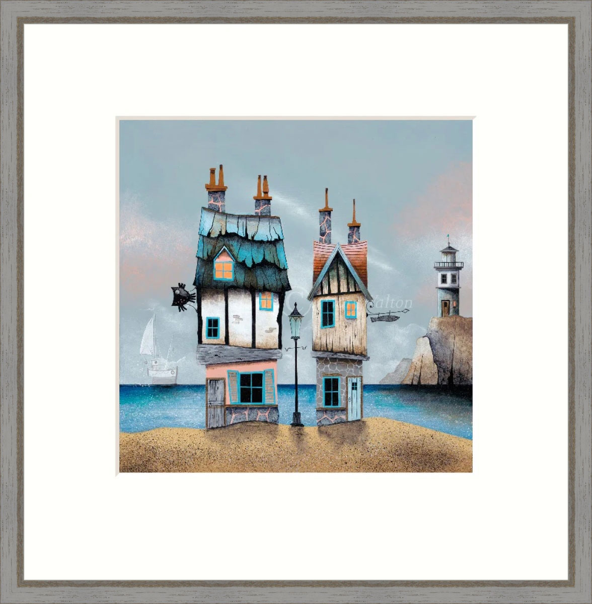 Framed in a soft, light grey wood moulding, enhancing the coastal charm without distracting from the artworkCaviar & Roe is a celebration of coastal storytelling, architectural charm, and maritime atmosphere. Collectors will enjoy its narrative richness, while newcomers are drawn into Waltons imaginative, characterful vision of seaside lifea perfect addition to any collection.