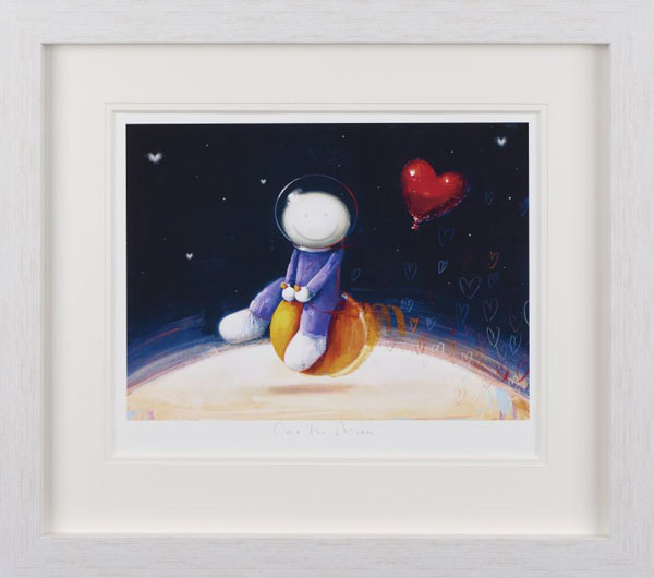 Over the Moon by Doug Hyde is a tender, dreamlike piece that leans fully into wonder, love, and that feeling of being blissfully lifted out of the everyday.The artwork shows Hydes familiar soft, childlike figure seated gently on a glowing crescent of moon or planet, floating against a deep, inky night sky.
