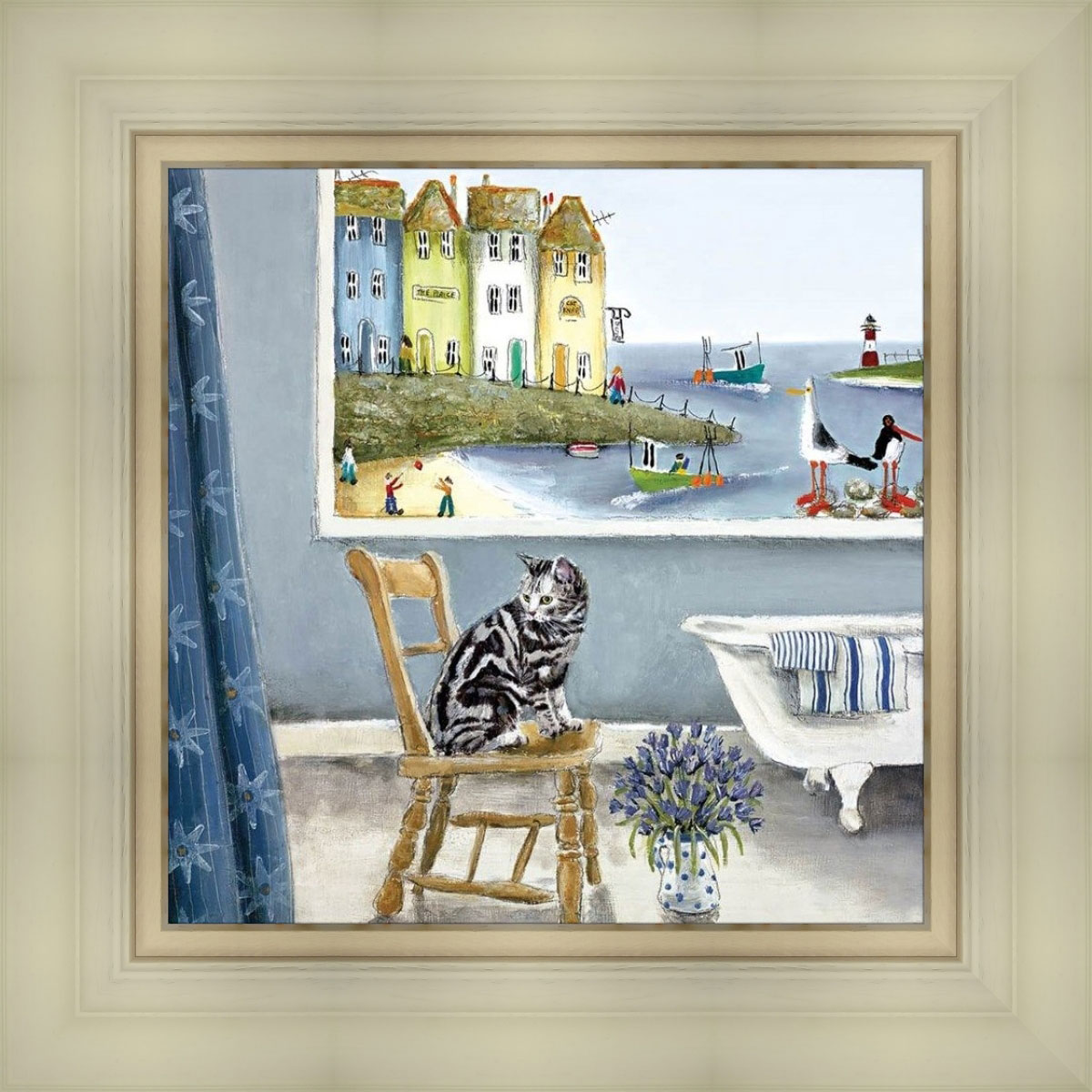 In this captivating giclée print on board, Lardner presents a wonderfully characterful scene centred around a calm, contented cat sitting neatly on a chair within a cosy bathroom. The feline appears perfectly at home, as if indulging in a moment of spa-day serenity - a light-hearted concept that underpins the work's charm. Despite the interior setting, the room feels connected to the outside world thanks to the large picture window behind the cat, through which a bright, bustling coastal village is revealed. This clever framing merges domestic quietude with seaside vibrancy, making the artwork feel both intimate and expansive.