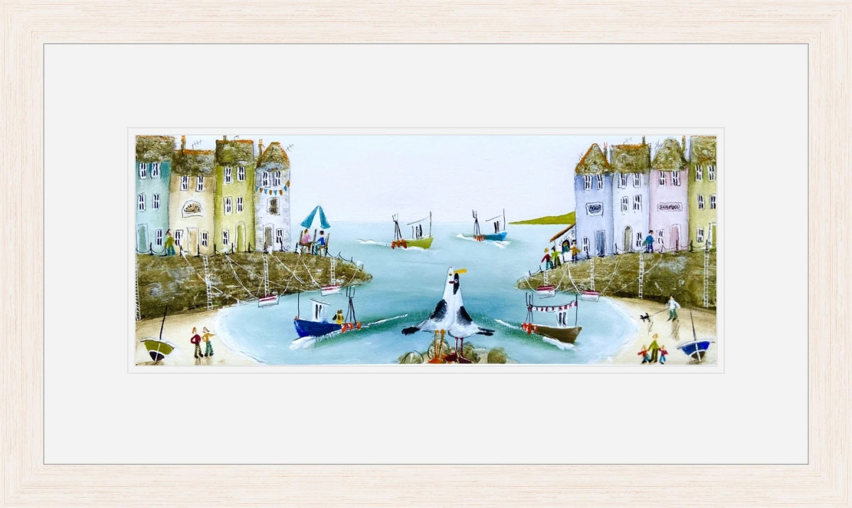 Presented as a giclée print on high-quality paper, Best Friends delivers exceptional colour depth and clarity, faithfully reflecting the charm and texture of Lardner's original painting. The artwork is elegantly double mounted in an off-white mount and completed with a contemporary off-white woodgrain frame that complements the coastal palette beautifully. The panoramic format enhances the sweeping feel of the harbour, giving the piece a striking presence on the wall whether displayed alone or as part of a curated collection.