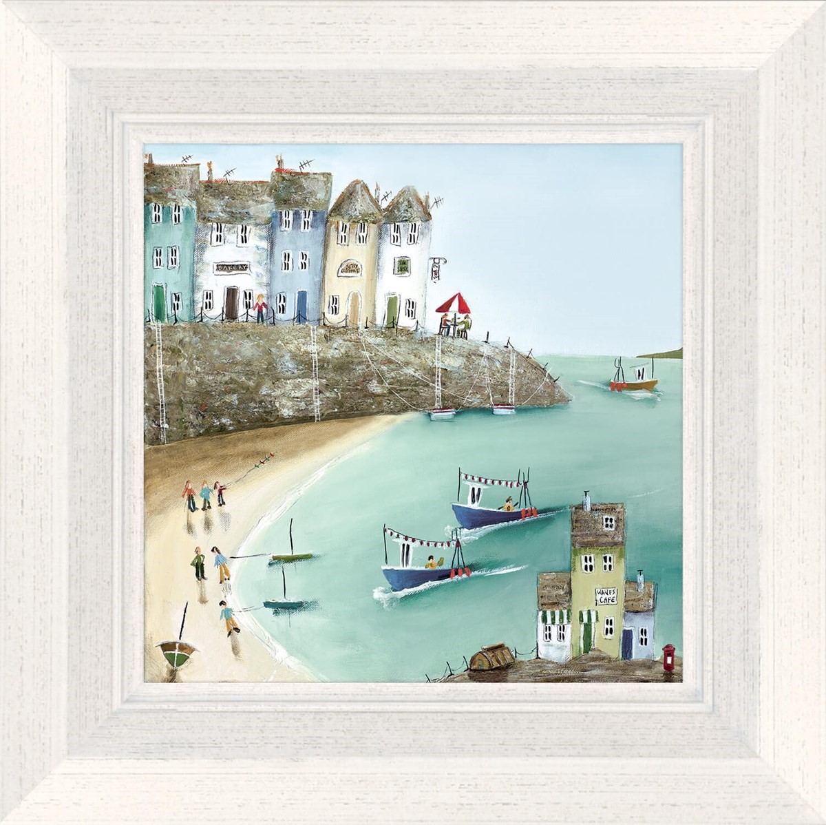 Spreading across the surrounding cove, a lively assortment of figures and activities brings the artwork to life. Tiny characters stroll along the shoreline, chat with neighbours, tend to boats, and enjoy the easy rhythm of a day by the coast. Each figure, though small in scale, is rendered with Lardner's characteristic precision, adding personality and narrative depth to the tableau. Their presence gives the scene a warm, communal spirit, echoing the charm of traditional seaside towns.